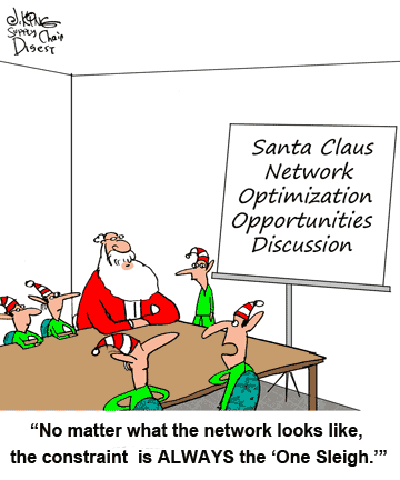 - Vehicle Routing Problem: However, the main problem that Santa and his associates face is the problem of route planning. Santa has to define not only the number of trips necessary to deliver all the presents but also the optimal routes for each of these trips. Santa seems to find himself in the situation of having to solve several travel salesman problems (TSPs): “Given a list of cities and the distances between each pair of cities, what is the shortest possible route that visits each city exactly once and returns to the origin city?”. If you would like to try solving one of these TSPs for Christmas with your children or friends, a few years ago Professor Laura Albert reported one of them on her blog Punk Rock Operation Research.